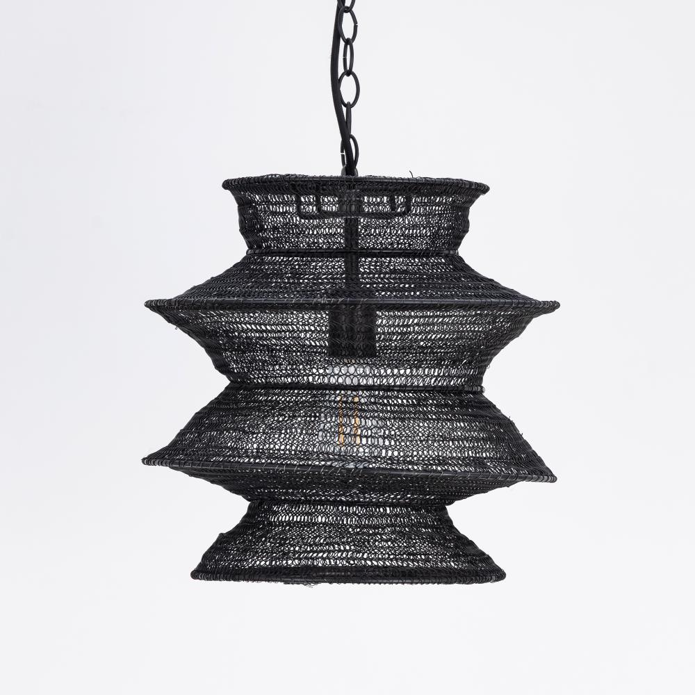 Airy yet impactful, Krabi brings sculptural movement and moody ambiance to any interior. Layers of black metal mesh form undulating rings that seem to float in place, tapering and expanding like a lantern in motion. When illuminated, the open-weave shade c
