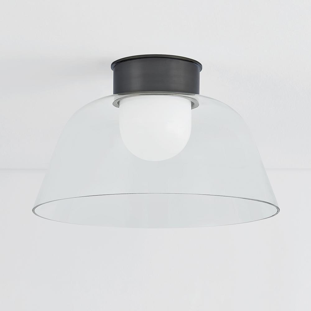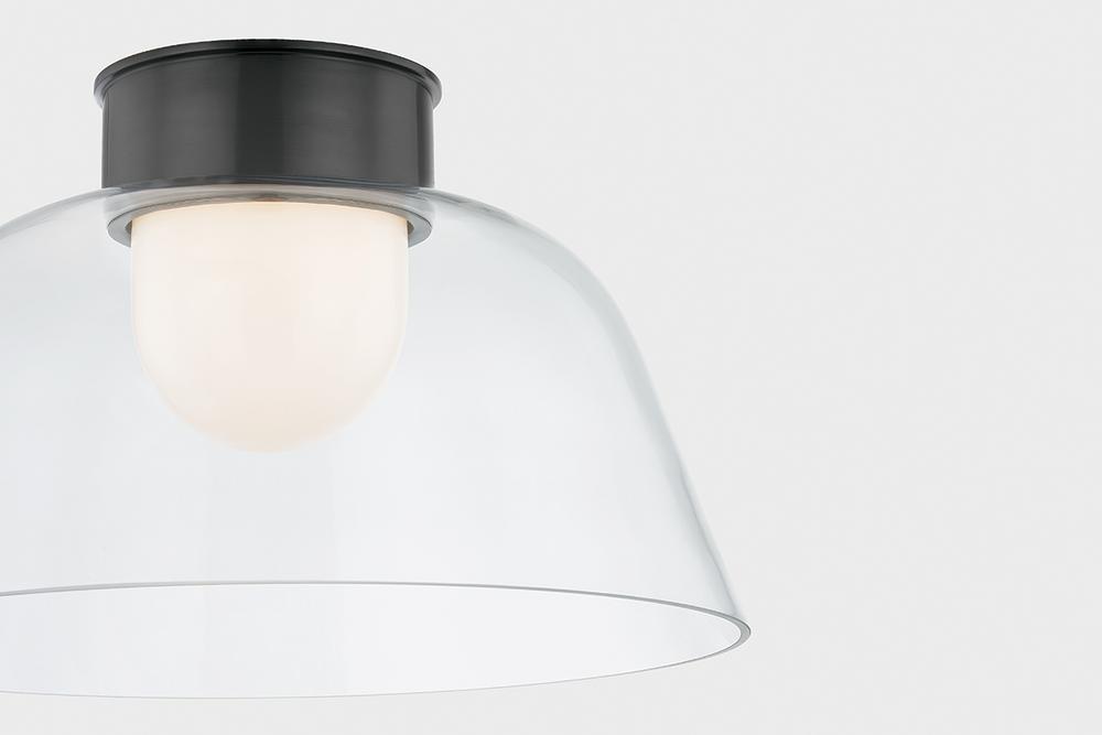 A celebration of the beauty of pared-down forms, Lakeside features an opal glossy inner diffuser surrounded by a clear outer glass layer. Shaped like a graceful bowl, this flush mount forgoes ornamentation save for its extra-tall metal canopy. Available in Aged Brass or Distressed Bronze finishes, the streamlined metalwork adds a decorative note to the minimalistic design.