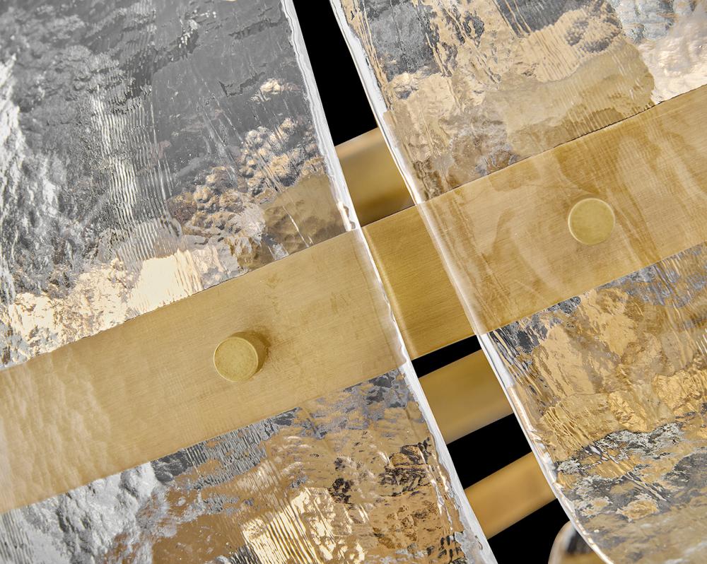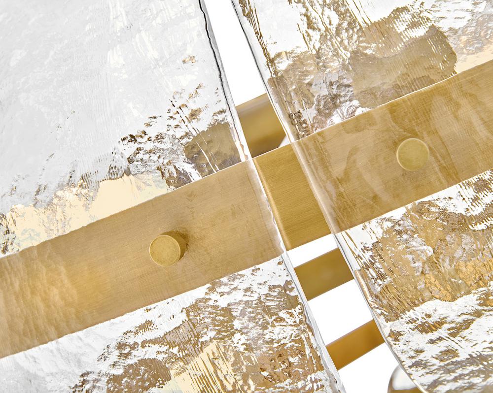 Inspired by the organic elegance of blooming water lilies, Lillia’s large shade is formed from gently curved glass panels. Subtle handcrafted texture creates natural variations in illumination, accentuated by a classic Heritage Brass finish.