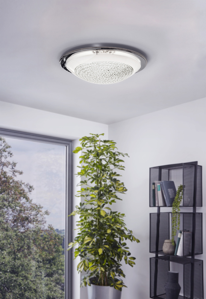 This Acolla flush mount ceiling light will add a sophisticated touch to your room. It features a beautiful round frame with white glass and clear crystals. It is a great complement to a contemporary and modern decor, from the bathroom to the bedroom.