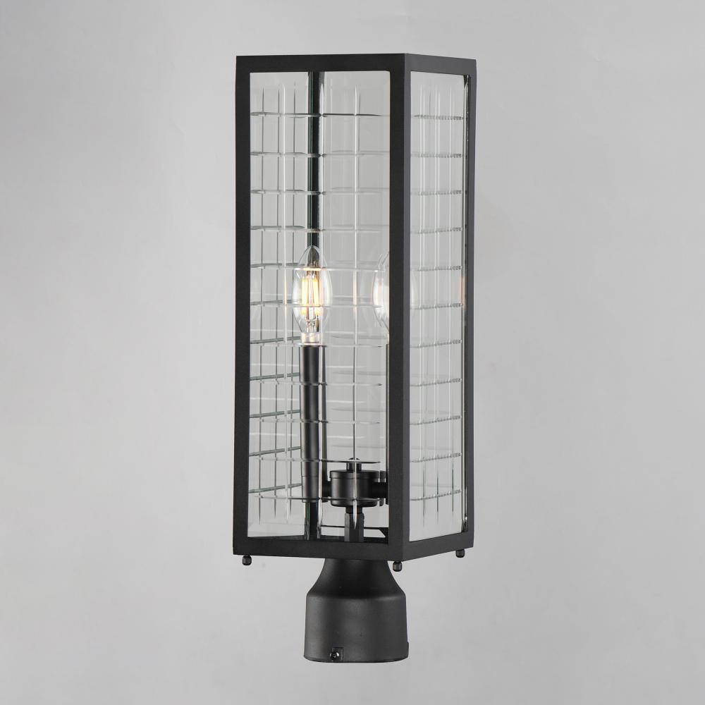 A simple square-framed lantern features deep etched squares on Clear glass, creating a captivating array of refracted light. Constructed from die-cast aluminum and finished in Matte Black, the design blends classic elements with a refreshing, modern approa