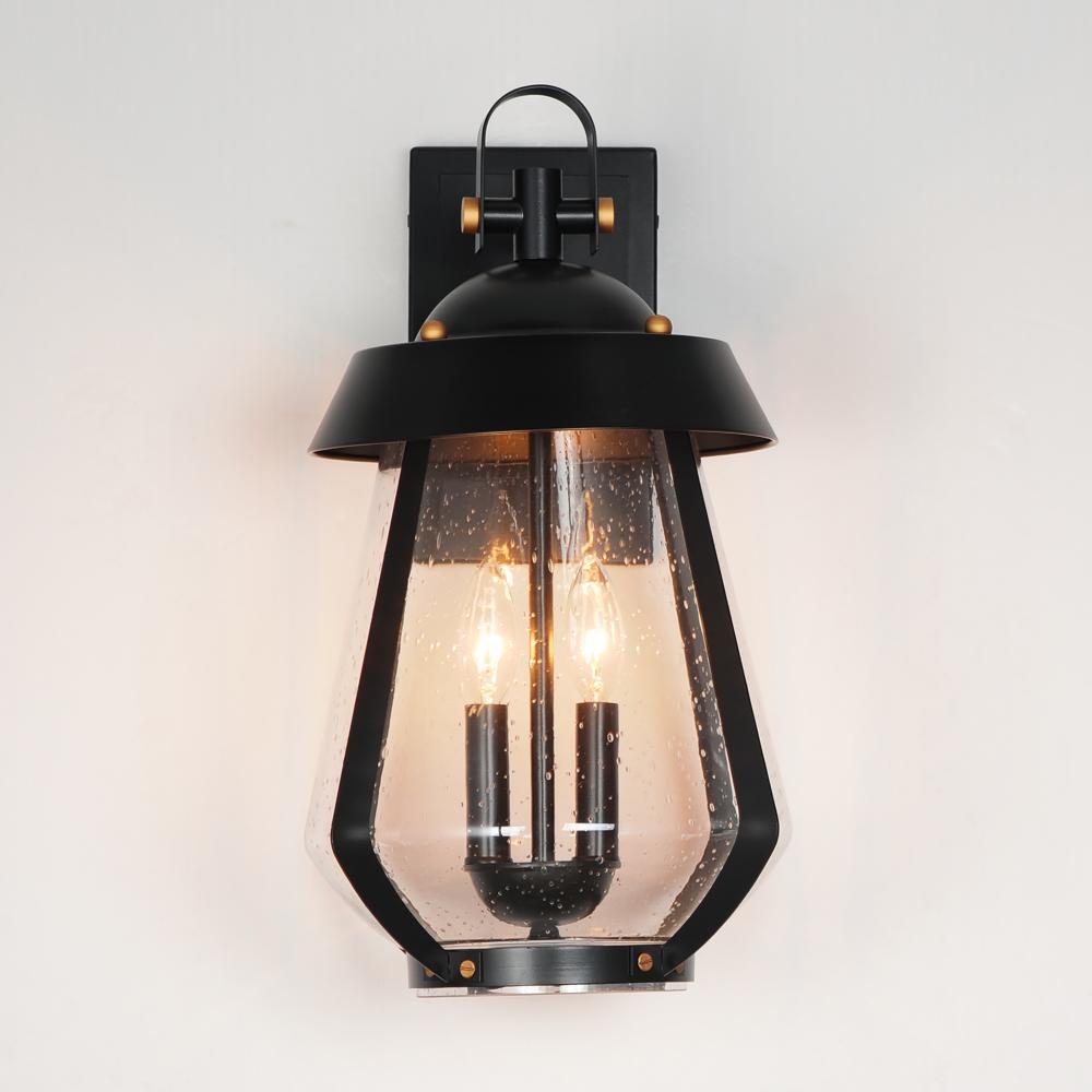 A nod to the nautical, the Marin outdoor sconces feature a two-tone frame of Black with Antique Brass details. Within the frame a pear shaped Clear Seeded glass shields a medium base lamp from the elements. Available in three sizes of sconce, two pendant c