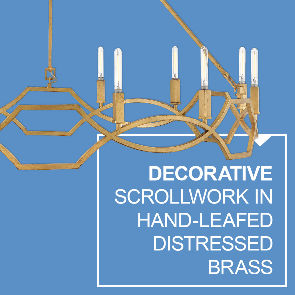 Leona’s decorative scrollwork is crafted from a gently curved, smoothly welded frame finished in hand-leafed Distressed Brass. Clean shapes complemented by exposed candelabra lamps create a family of formal fixtures with undeniable charm.
