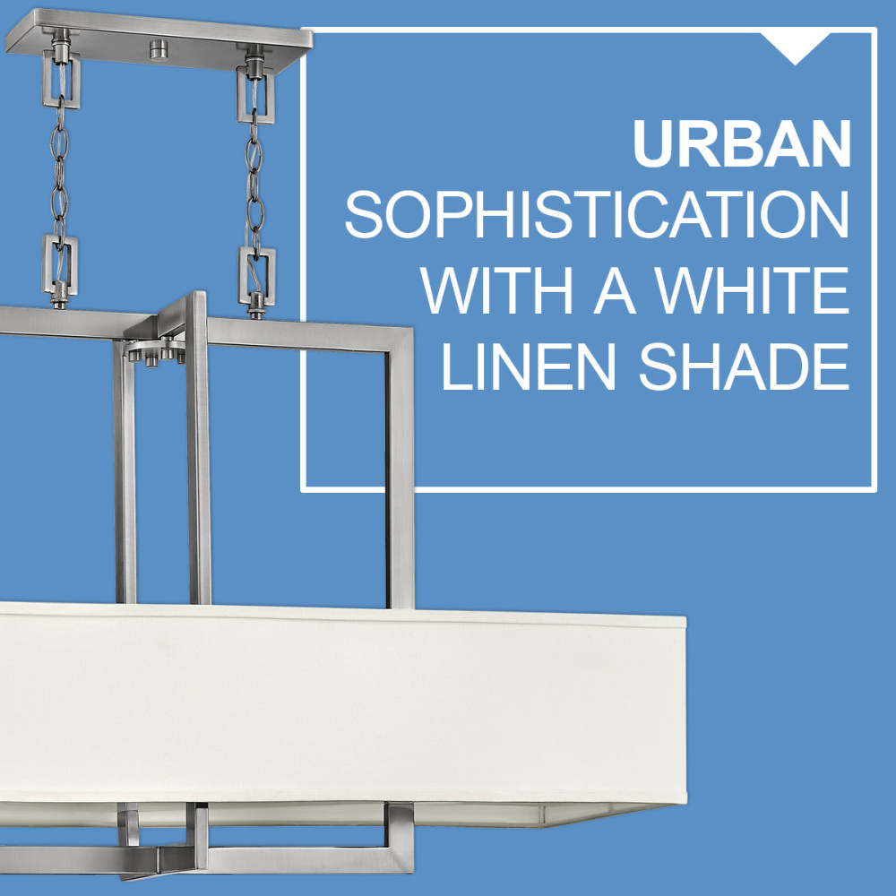 Hampton is a modern transitional design, offering the ultimate in urban sophistication. The minimal, rectangular frame is softened by a contemporary off-white linen drum shade.