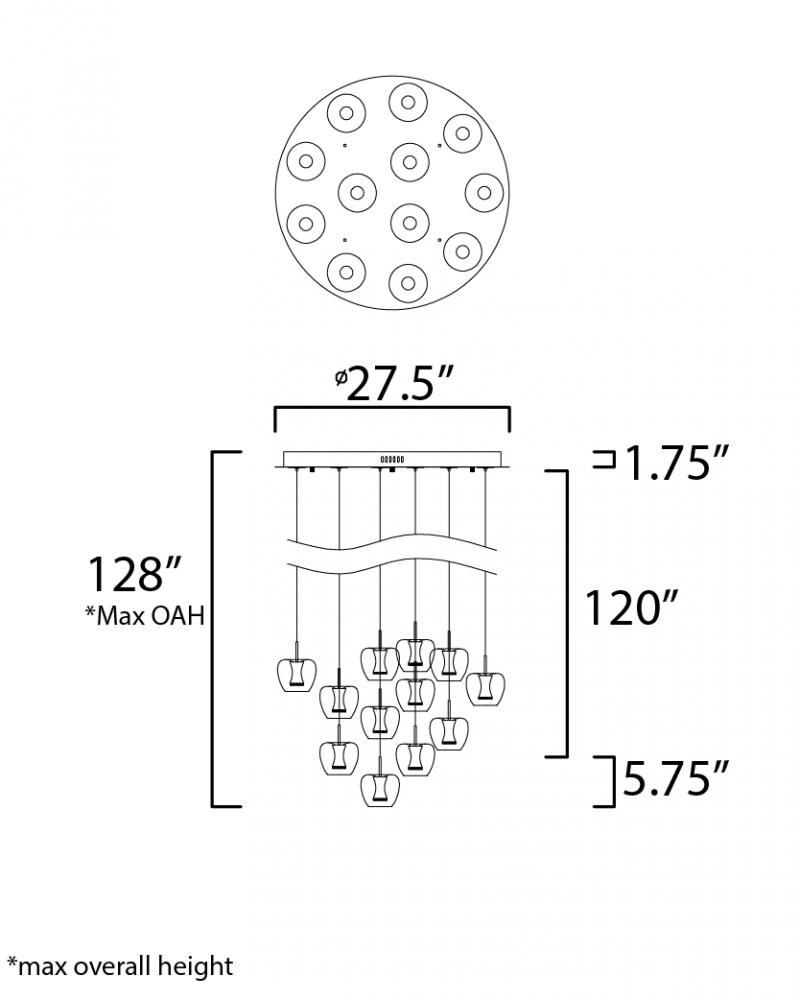 Clear apple shaped glass rest on machined aluminum fonts finished in Satin Brass with integrated LED for even Illumination without the glare. The large scale 25 light comes pre-arranged for ease of installation and is perfect for that tall ceiling applicat