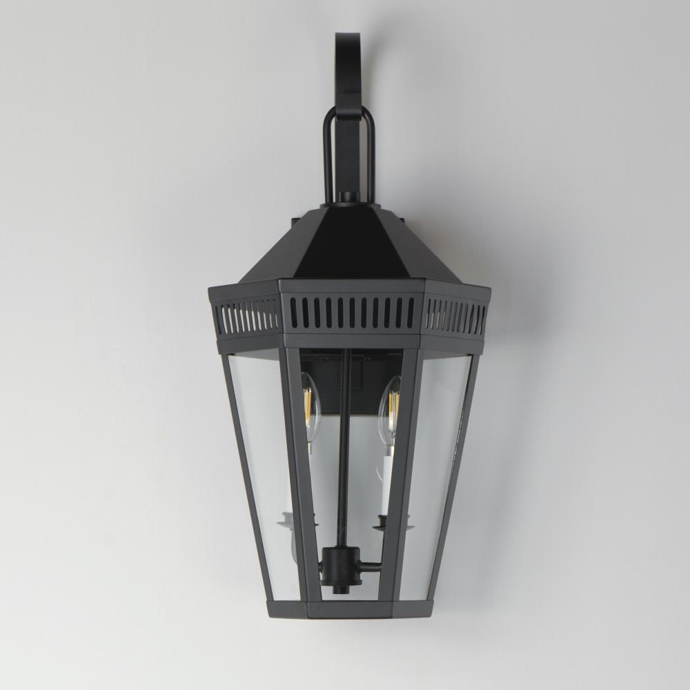 Stately lanterns with perforated filigree along the hood casts a beautiful lighting effect. Finished in Matte Black, the collection is available in multiple sizes as well as flush mount, deck lantern, and two sizes of pendants.