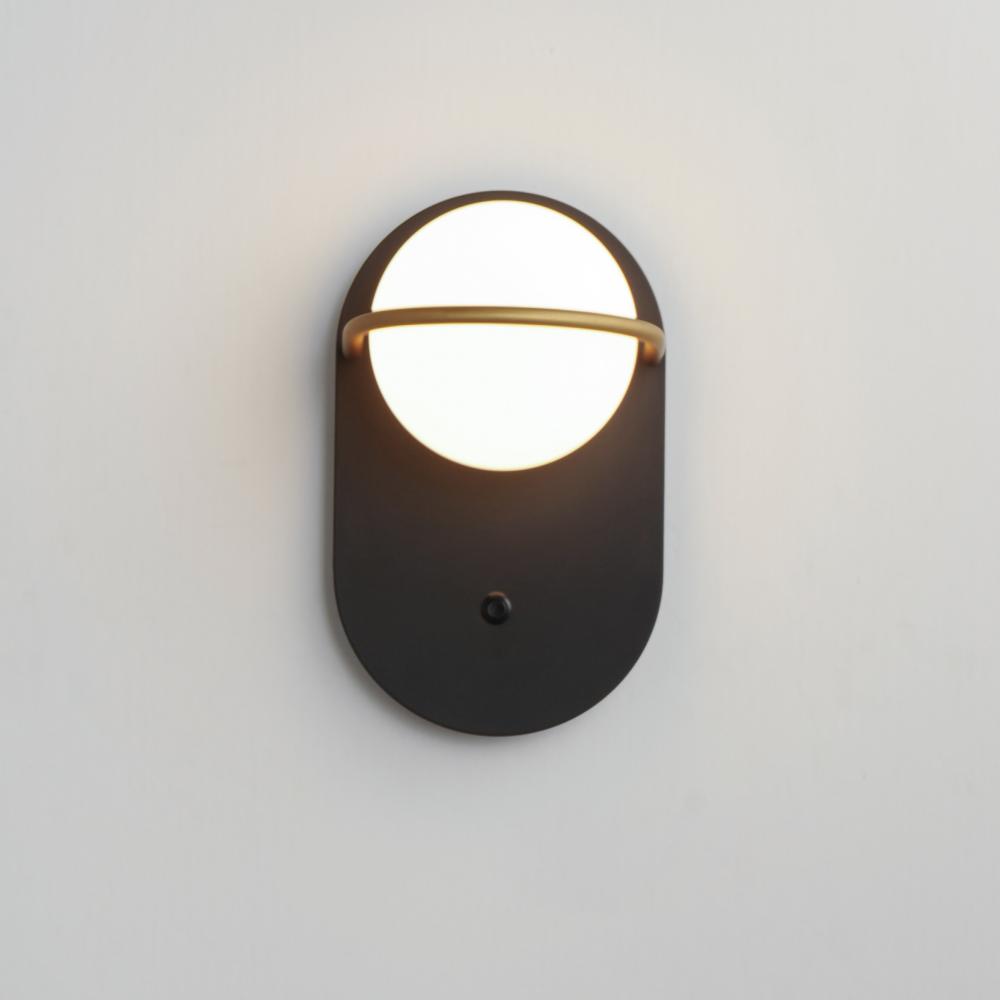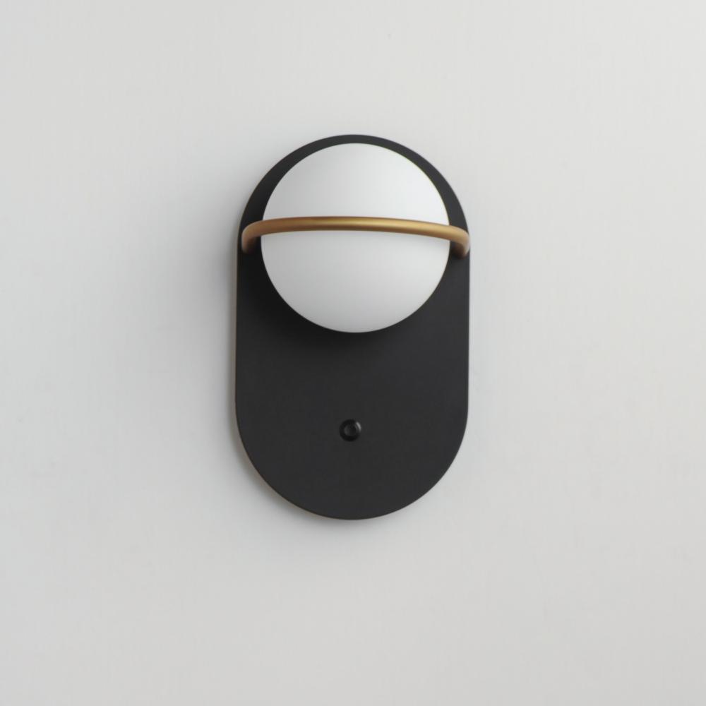 Satin White glass globes are nested behind rings of Gold which dramatically contrasts against the Black metal background. A bedside single sconce features a slim on/off rocker switch that adds convenience to the stylish design. Soft and natural light is pr