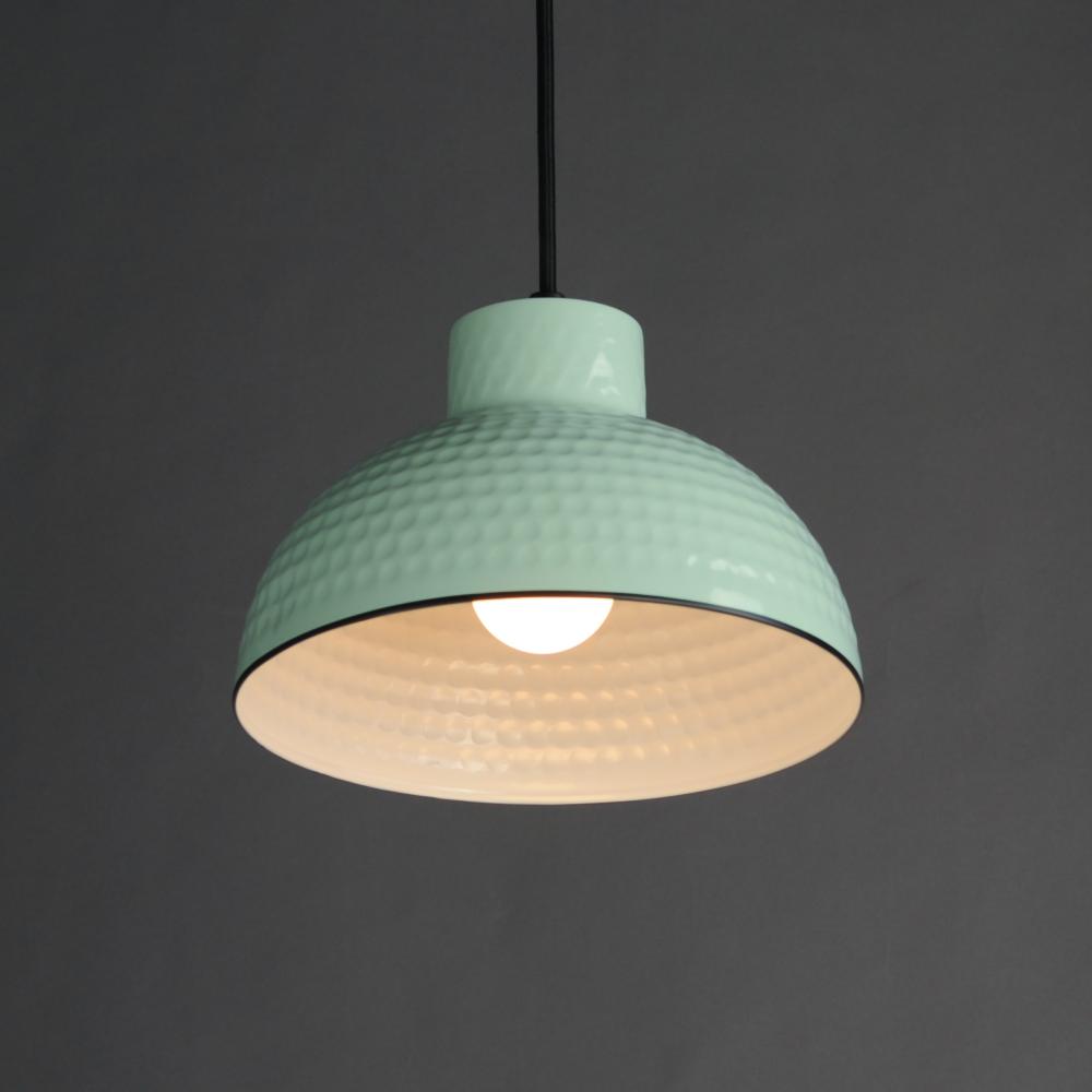 Hammered metal dome shades are painted in glossy enamel paints that welcomes a nautical look. Available in Sage Green with a glossy white interior or Glossy Black with an Antique Copper interior, these pendants embody a nostalgic element that prevails alon