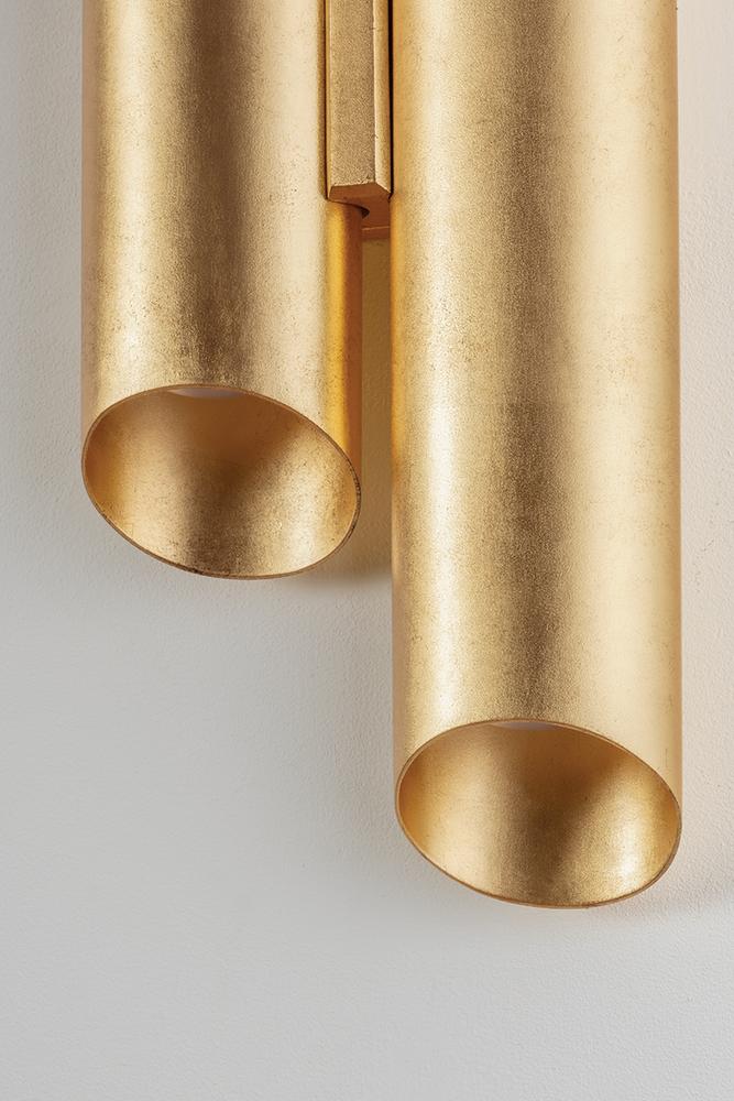 The eye-catching asymmetric design of Rylane features two vertical tubular shades finished in lustrous Vintage Gold Leaf. The cylindrical forms contain two lights each, directing light both up and down. Adding a romantic glow to soft lighting schemes, this organic-inspired sconce is a modern treasure.