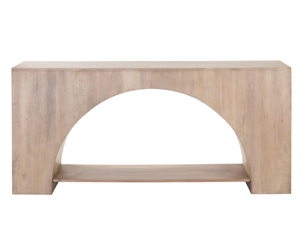 With a captivating arch design, this modern console table illustrates the beauty of simplicity. Crafted from solid light acacia wood with a whitewash finish. Coordinating side table also available. As wood is an organic, porous material, these pieces will contain natural variation of texture and may also exhibit fine indentations and cracks. Wood pieces will also display a disparity of colour and grain, and visible knots and burls that add to the character of each piece.
