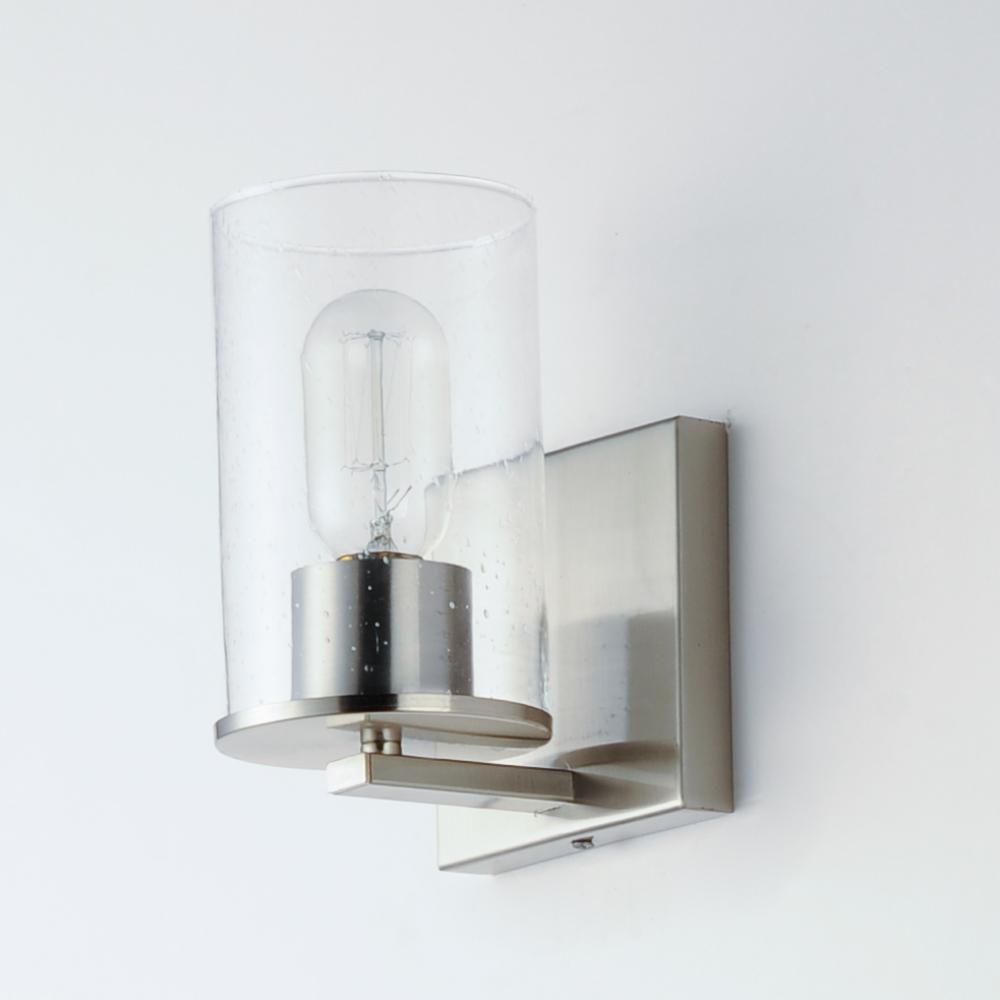 Cylinders in Clear Seeded glass on simple Satin Nickel frames or matte Black frames with Antiqued Brass socket covers. Pivoting arms on chandelier allow it to direct light up or down. Use filament lamps either tubular or Edison in shape for a Coastal or In