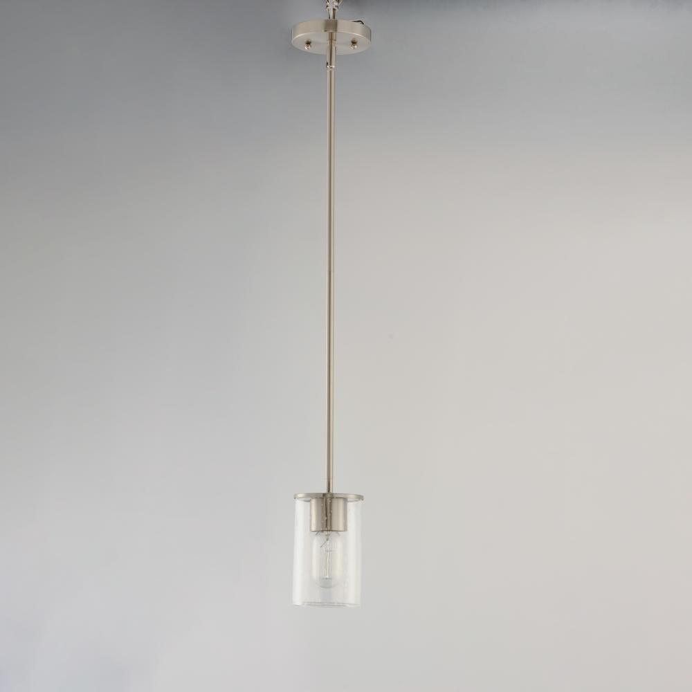 Cylinders in Clear Seeded glass on simple Satin Nickel frames or matte Black frames with Antiqued Brass socket covers. Pivoting arms on chandelier allow it to direct light up or down. Use filament lamps either tubular or Edison in shape for a Coastal or In