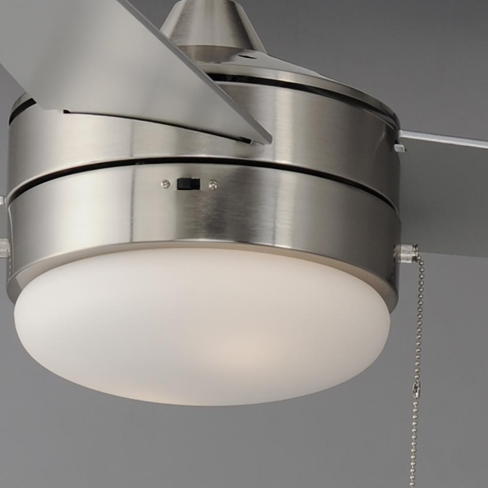 A contemporary, yet transitional look at economical pricing, the Trio fan is finished in Satin Nickel with 3 straight fan blades in Black on one side and silver on the other side. The fan is powered by an included wall control or pull chain as well as LED