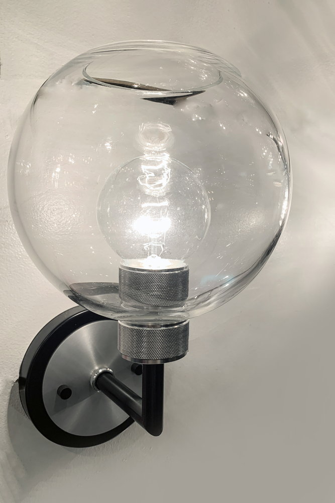 Machined and knurled sockets are finished in Brushed Aluminum which gives stark contrast to the Black round tube frames. Heavy weight Clear hand-blown glass spheres adds scale to this industrial classic.