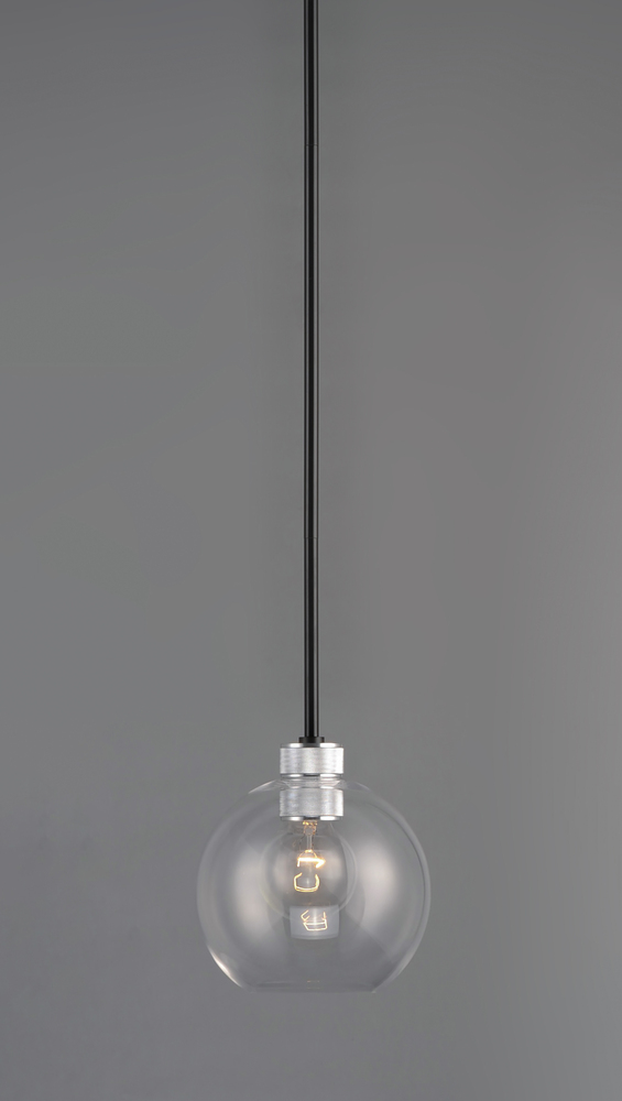 Machined and knurled sockets are finished in Brushed Aluminum which gives stark contrast to the Black round tube frames. Heavy weight Clear hand-blown glass spheres adds scale to this industrial classic.