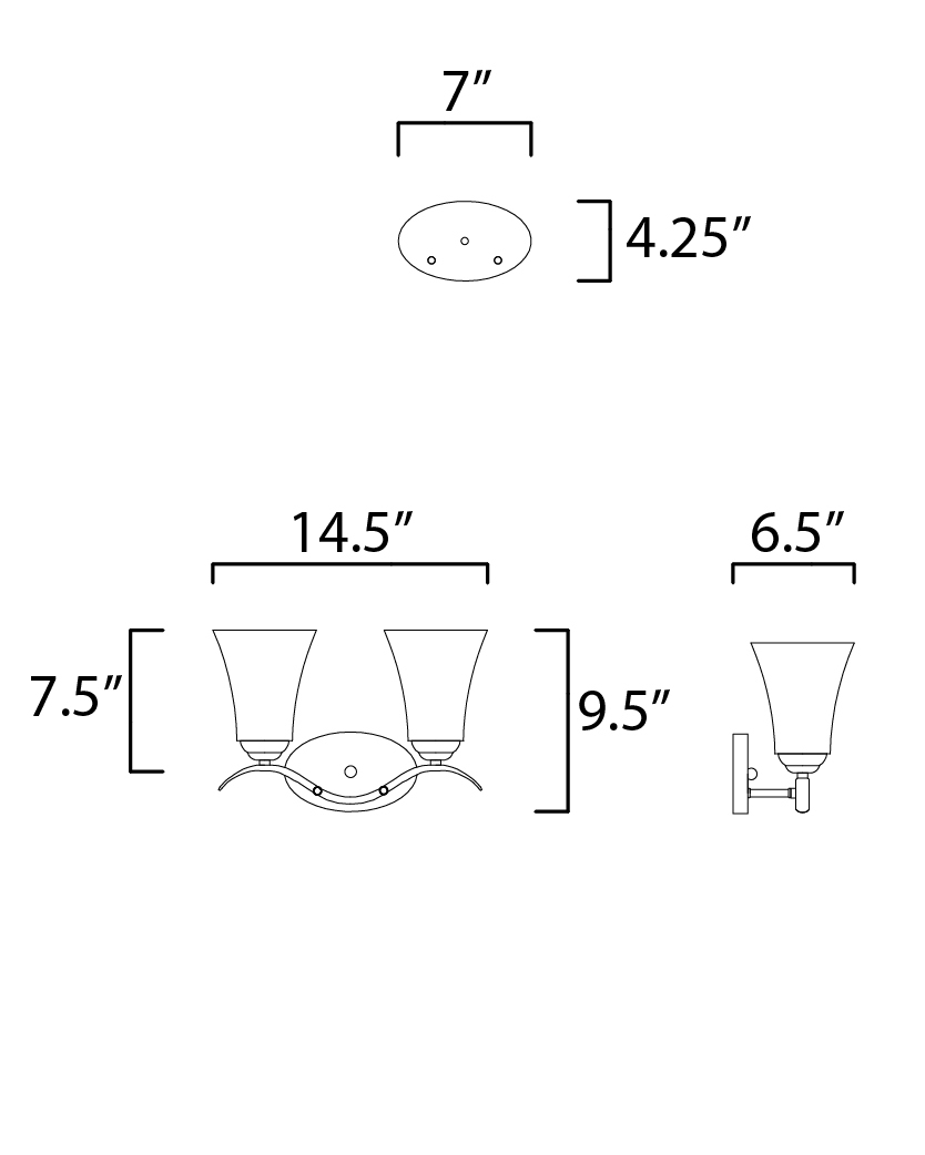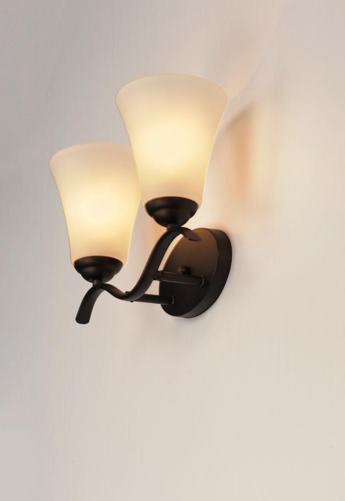 Gently waving arms of Satin Nickel or Oil Rubbed Bronze support tall-profile Frosted glass shades creating a scale normally not found in this category of lighting. The bath vanity may be installed up or down and also includes a Polished Chrome finish.