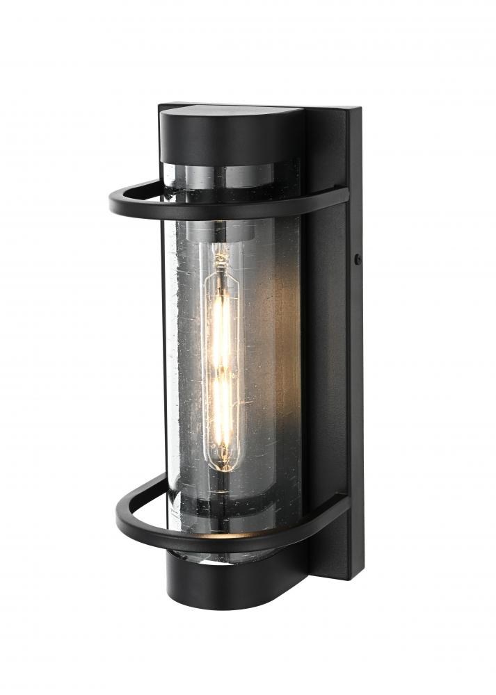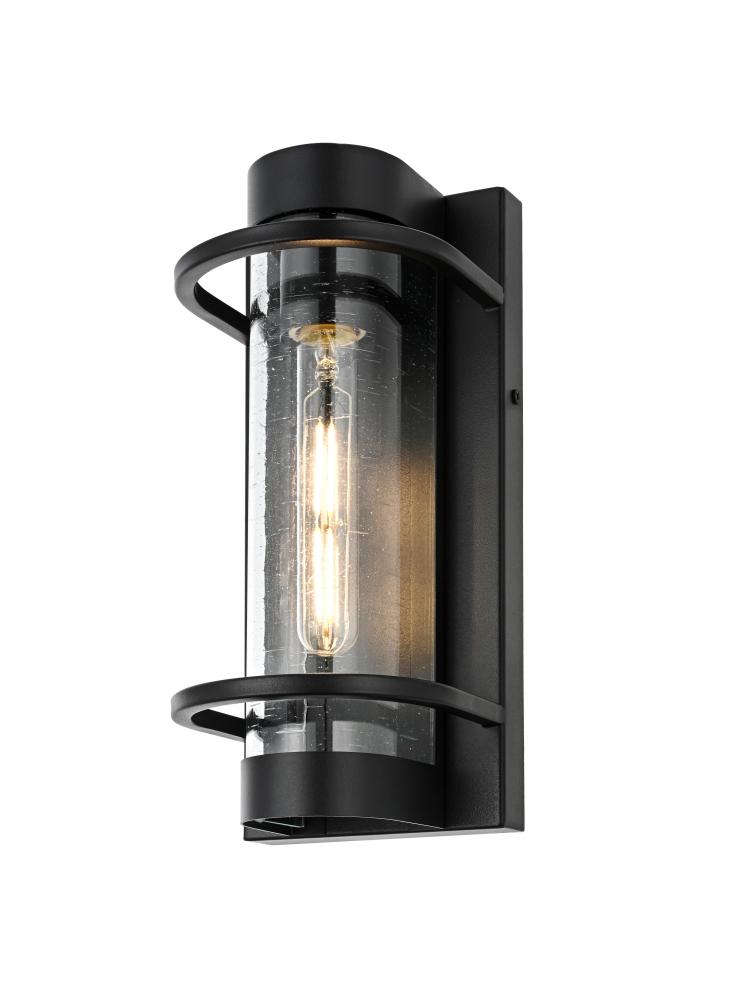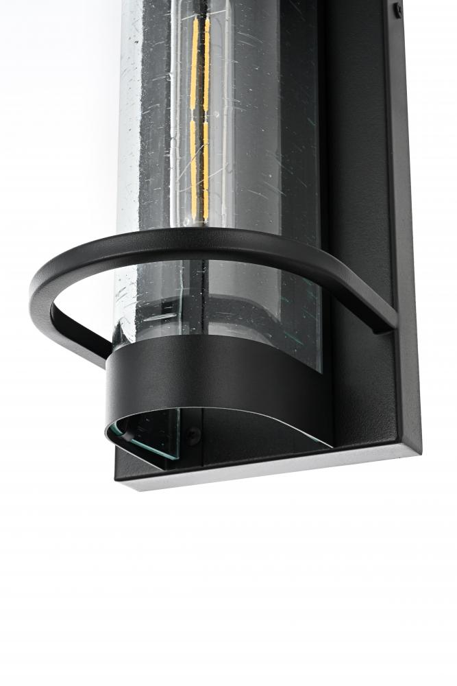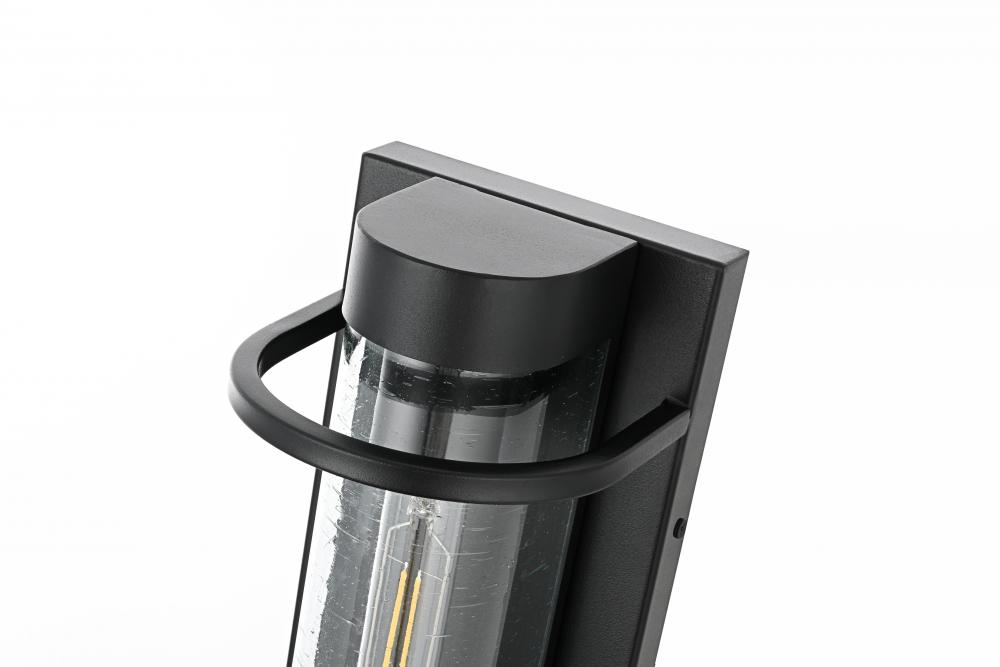 The cylindrical glass shade is crafted from clear seeded glass, providing a textured, sparkling effect that enhances the light and adds character to your outdoor area.
