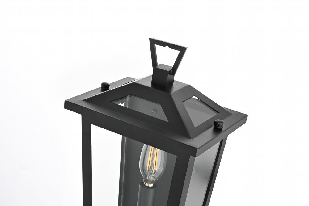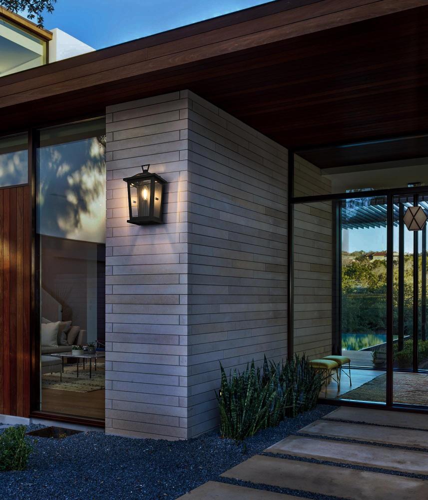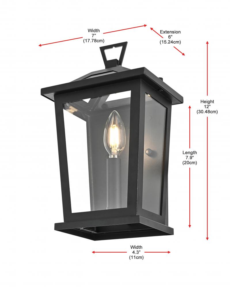 Add a timeless appeal to your exterior with this sophisticated outdoor wall sconce. Crafted from sturdy iron and glass, this wall sconce features a classic lantern-inspired design with clean lines and clear glass panels that add both form and function to your outdoor space. Its matte black finish beautifully contrasts with the bright glow from the E12 bulb, creating a warm and welcoming ambiance for any entryway, porch, or patio. The open base design ensures effortless bulb replacement while the robust materials provide durability, even in changing weather conditions. This wall sconce is perfect for those who want to enhance their outdoor decor with a fixture that showcases both contemporary charm and vintage flair.