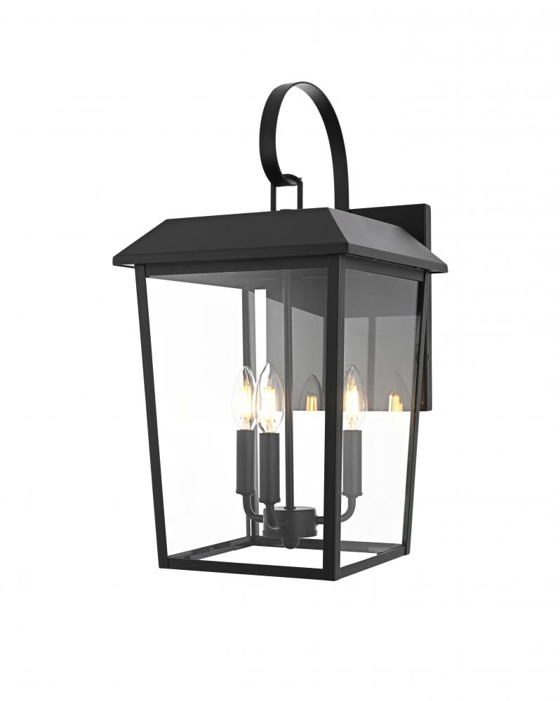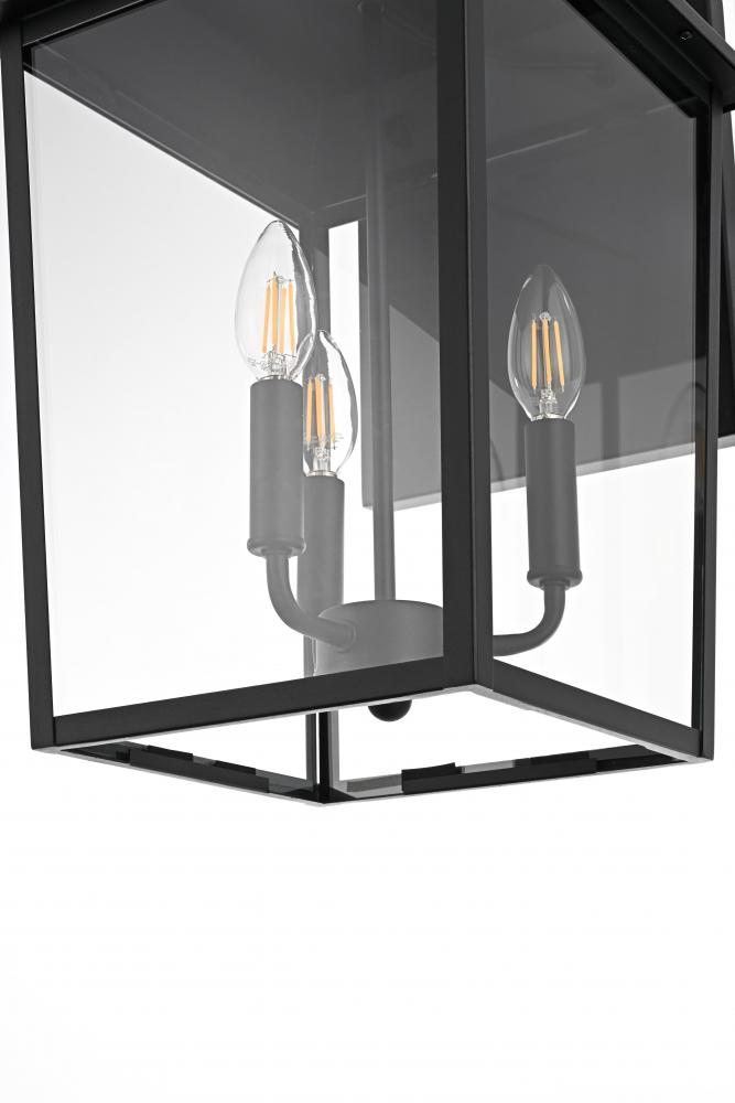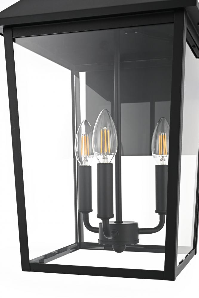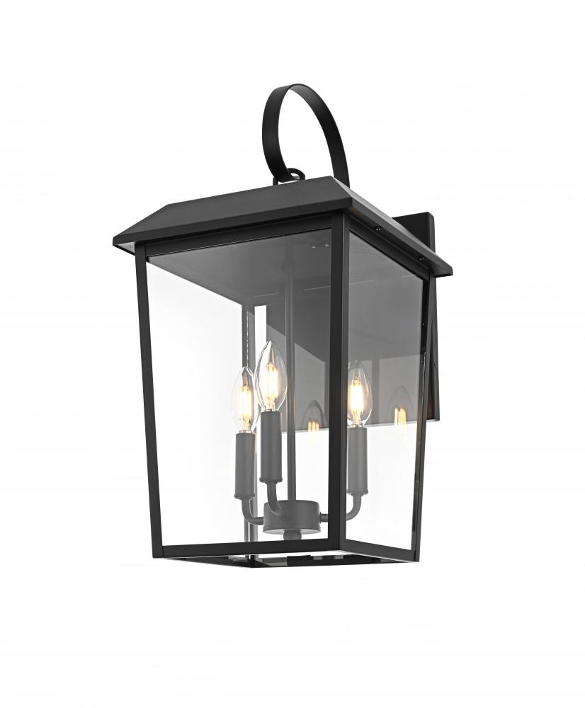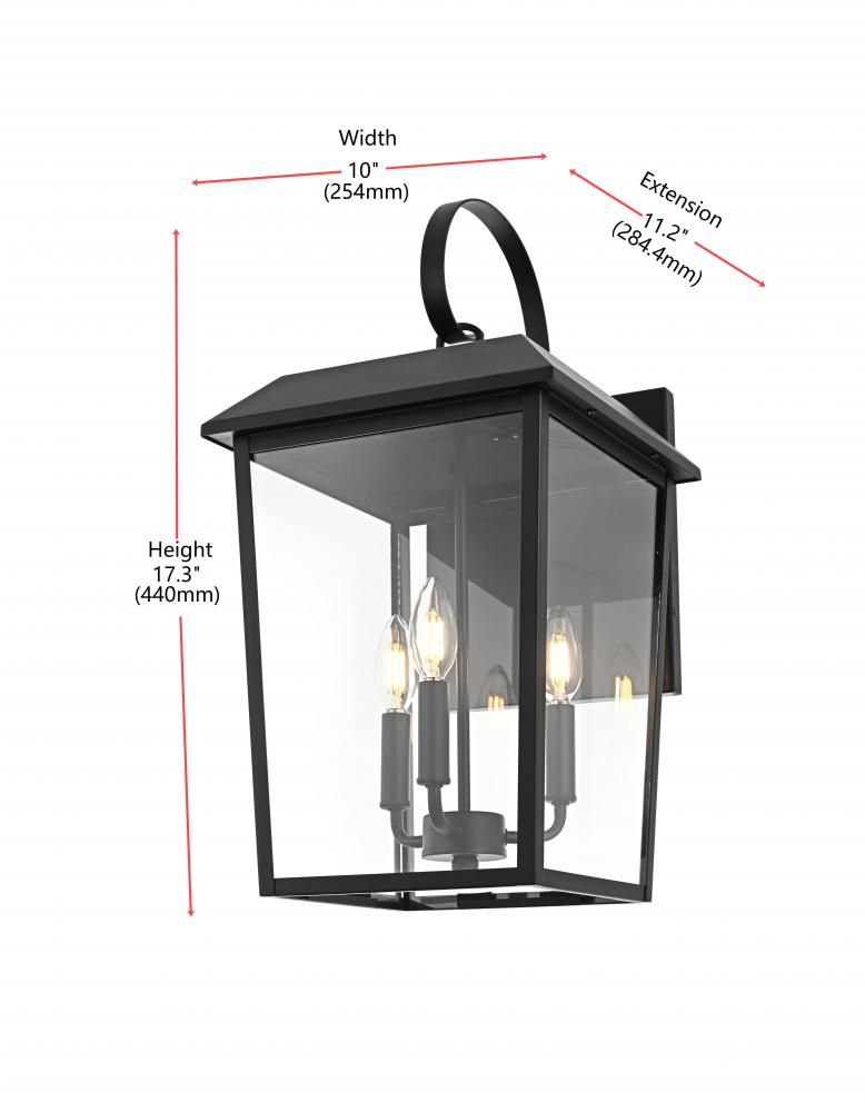 Enhance your home’s curb appeal with this striking outdoor wall sconce. Crafted from sturdy iron and framed with crystal-clear glass, this sconce embodies a bold rectangular lantern design that radiates classic charm. with three candelabra-style bulbs, it casts a warm, inviting glow, beautifully amplified by the clear glass panels. The matte black finish and curved arm detail add a touch of architectural refinement, while its weather-resistant design ensures lasting beauty. Perfect for entrances, patios, or walkways, this sconce lights the way in style.