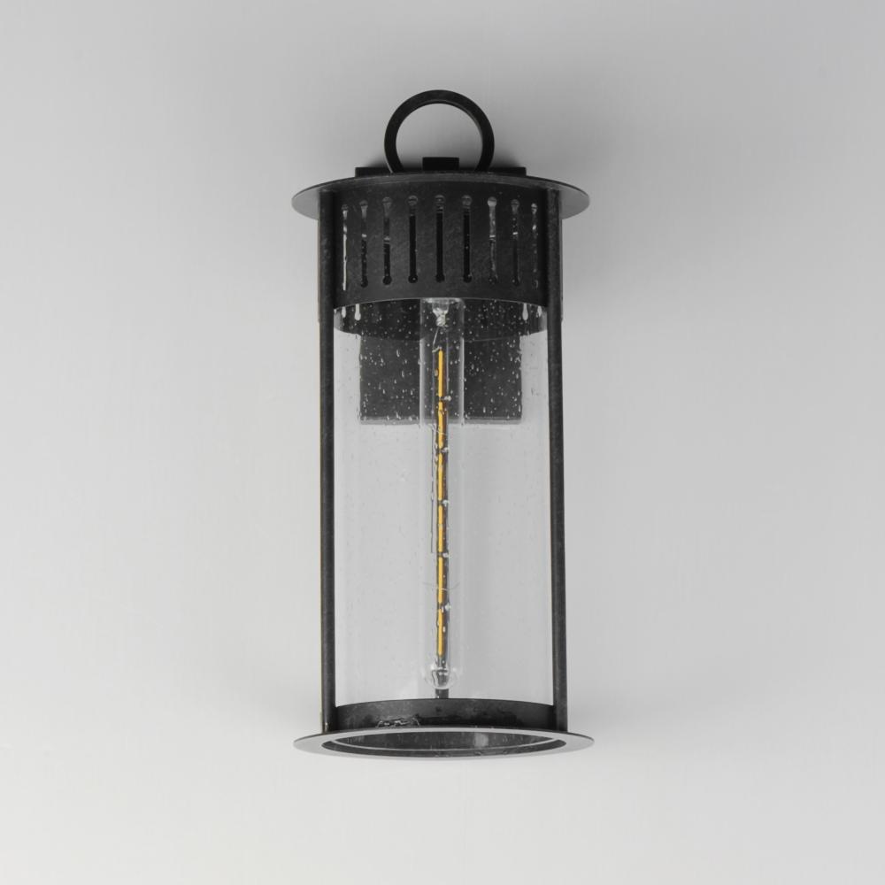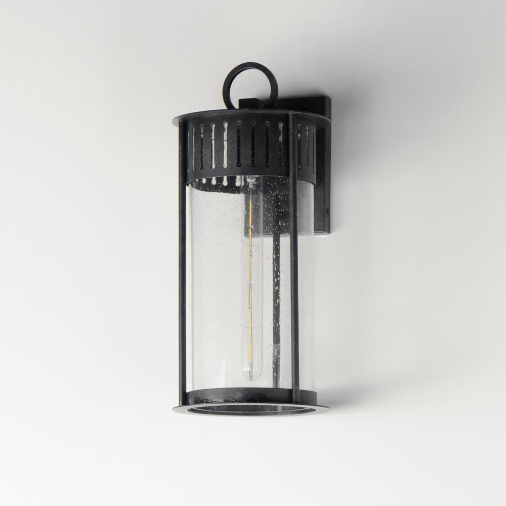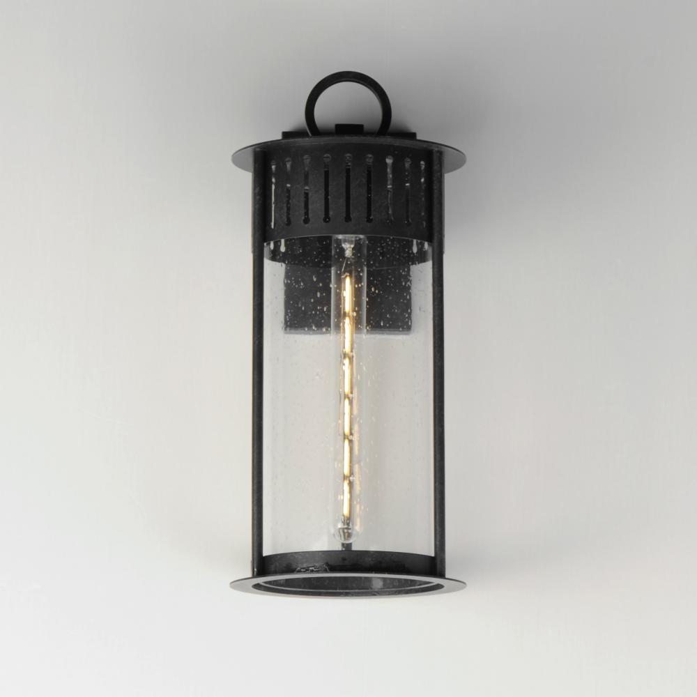 Inspired by the rounded towers of Windsor Castle, this outdoor lighting collection features a hand-applied Black Patina finish on Stainless Steel. A slotted filigree along the top of the cylinder frame allows light to escape, while the clear seeded glass o